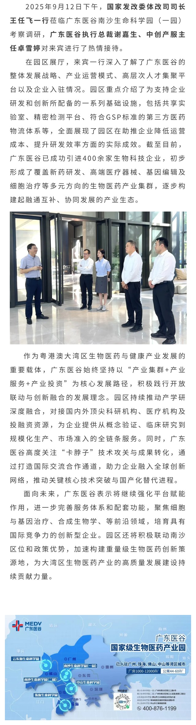 國家發(fā)改委體改司司長王任飛一行蒞臨廣東醫(yī)谷考察調(diào)研
